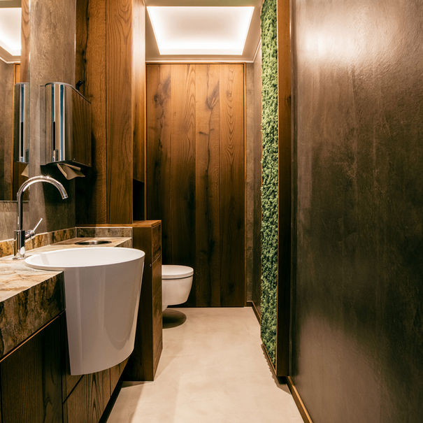 Für ein Ingenieurbüro aus unserem Netzwerk haben wir die vier WC-Räume eines Bürogebäudes komplett umgestaltet. Die Herausforderung bestand darin, auf jeder Etage einen einzigartigen Charakter zu schaffen, obwohl die Räume schmal und lang waren. Durch einen kompletten Rückbau und sorgfältige Installationsarbeiten entstand ein harmonisches Gesamtbild, das individuelle Designmerkmale mit funktionaler Eleganz verbindet. Mit einer besonderen Materialauswahl, die Beton, Moos und Altholz vereint, sowie maßgeschneiderten Möblierungselementen und Sanitär-Accessoires, wurden die WC-Räume zu modernen, inspirierenden Rückzugsorten. Dazu kamen neue Zimmertüren, Malerarbeiten, Elektroinstallation und Beleuchtung, die das Gesamtbild abrunden.